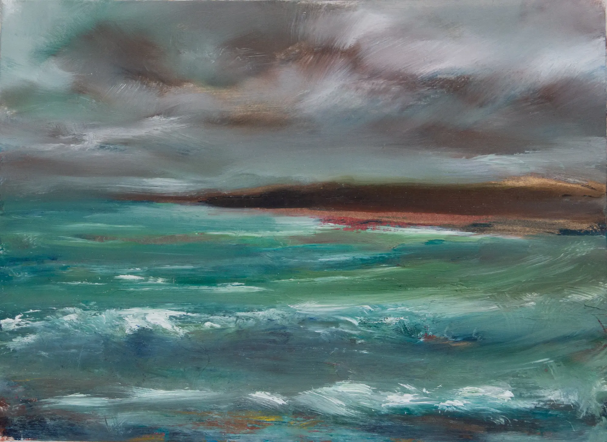I often use a complementary colour as a wash on the canvas. For me, it gives a glow behind the sky and can tie the painting together in a more organic way.